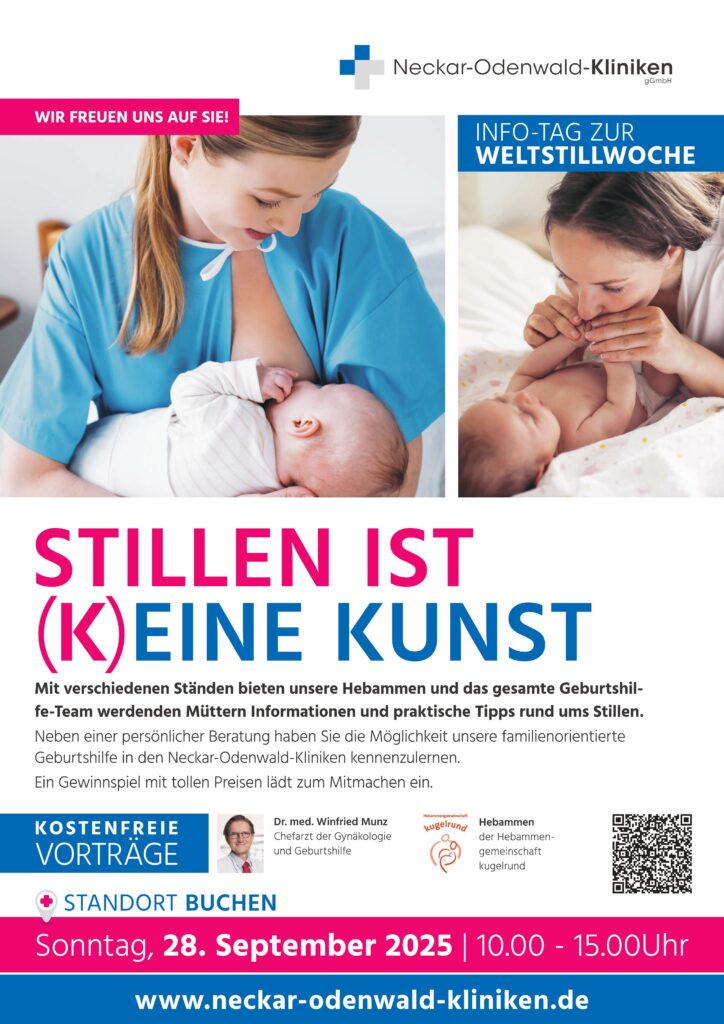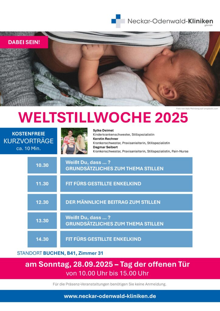 Am Sonntag, den 28. September 2025 von 10 bis 15 Uhr findet im 2. Obergeschoss der Neckar-Odenwald-Kliniken, im Kreißsaal und der Station B41, ein Info-Tag zur Weltstillwoche statt.